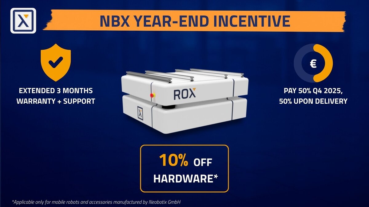 Designed for research institutions and industrial customers finalizing their year-end purchases, the NBX Year End Incentive offers a unique opportunity to acquire high-quality mobile robots and mobile manipulators at a reduced price — now with a flexible payment option to support your planning.